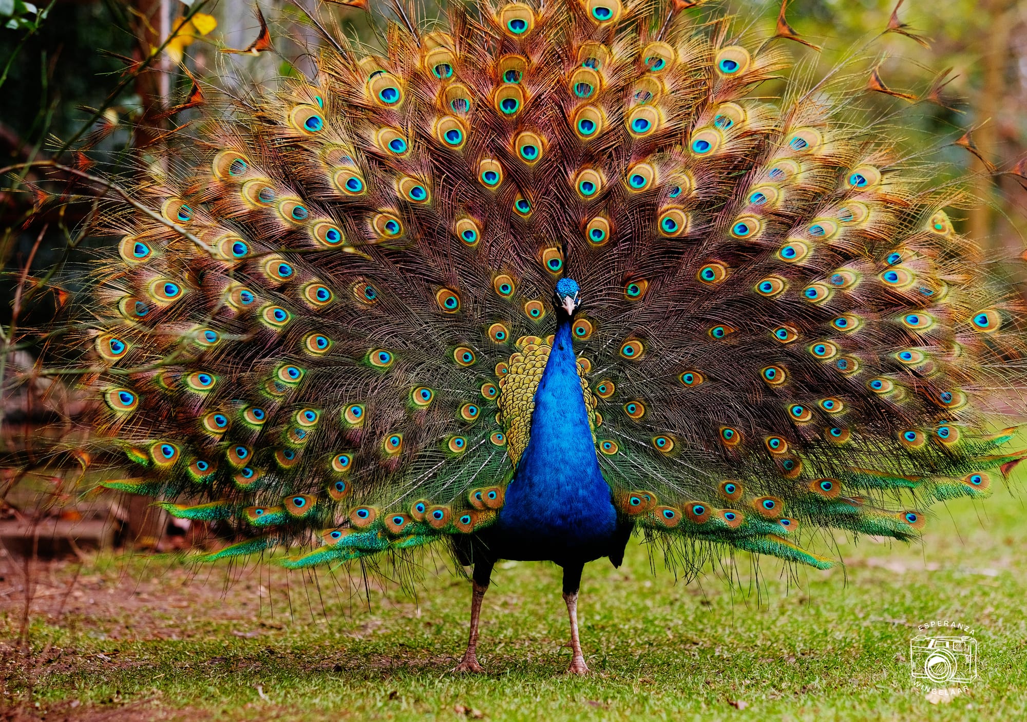Wist je trouwens dat het eigenlijk geen staartveren zijn maar rugveren? Zijn staart is in principe heel kort zoals die van een vrouwtjespauw. Als hij gaat pronken of dansen dan schuddelt hij met die korte staart en maakt hij stapjes opzij en weer terug. Ergens tijdens die dans zet hij ineens zijn lange nekveren omhoog en schudt hij ze uit als een Spaanse waaier. Vaak laat hij ze op een speciale manier trillen en verrast daarbij niet enkel zijn vrouwtje maar ook onverschillige kippen of katten die hij tegenkomt op zijn versiertoer.